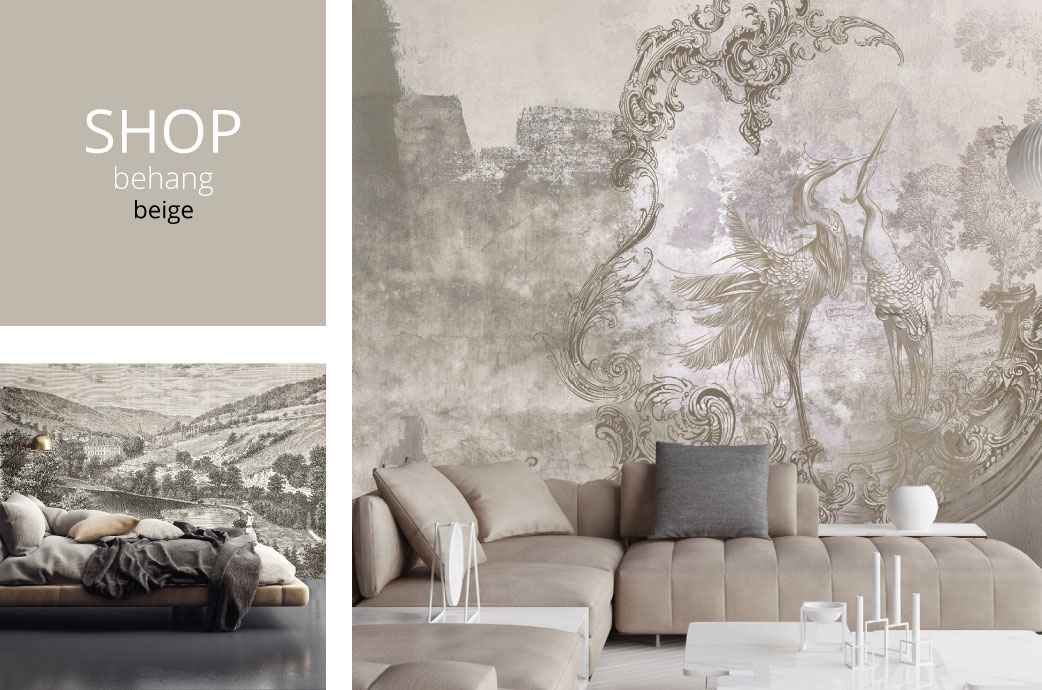Dit gravure behang heeft een mooie beige basis. Prachtig bij alle soorten hout. Het zijn oude tekeningen die veel sfeer geven aan jouw interieur.